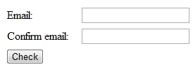 <hmtl> <head><title> Email Confirmation Form with Validation - www.xDev.gr </title></head> <script type="text/javascript" src="http://ajax.googleapis.com/ajax/libs/jquery/1.7.1/jquery.min.js"></script> <body> <table> <tr><td width="100px;">Email:</td><td><input id="Text1" type="text" /></td></tr> <tr><td width="100px;">Confirm email:</td><td><input id="Text2" type="text" /></td></tr> </table> <input id="Button1" type="button" value="Check" /> <script type="text/javascript"> function validateEmail(email) { var re = /^(([^<>()[\]\\.,;:\s@\"]+(\.[^<>()[\]\\.,;:\s@\"]+)*)|(\".+\"))@((\[[0-9]{1,3}\.[0-9]{1,3}\.[0-9]{1,3}\.[0-9]{1,3}\])|(([a-zA-Z\-0-9]+\.)+[a-zA-Z]{2,}))$/; return re.test(email); } $("#Button1").click(function compEmail() { var emPrim = $("#Text1").val(), emConf = $("#Text2").val(); if (((emPrim != null) && (emPrim.length != 0)) && ((emConf != null) && (emConf.length != 0))) { emPrim = emPrim.toLowerCase(); emConf = emConf.toLowerCase(); if ((emPrim == emConf) && (validateEmail(emPrim))) { alert("Valid email address, please proceed!"); return true; } else { alert("Not a valid email address. Please try again!"); return false; } } }); </script> </body> </html>